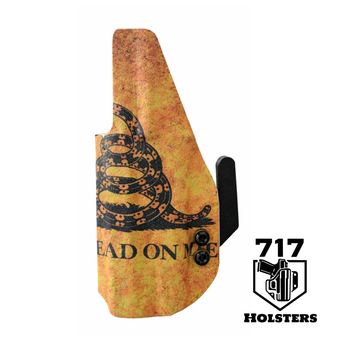 Featuring the iconic Gadsden rattlesnake over a distressed, battle-worn flag background, this holster delivers a bold, unmistakable statement. Sublimated in-house on a white Kydex base, the design is permanently infused into the material, ensuring it will never fade, peel, or wear away.